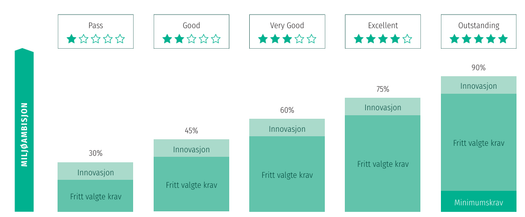 For å oppnå klassifiseringsnivået Outstanding må prosjektet ha et resultat på ≥ 90 % og innfri minstekrav. Se også side 17 i manualen for mer informasjon.